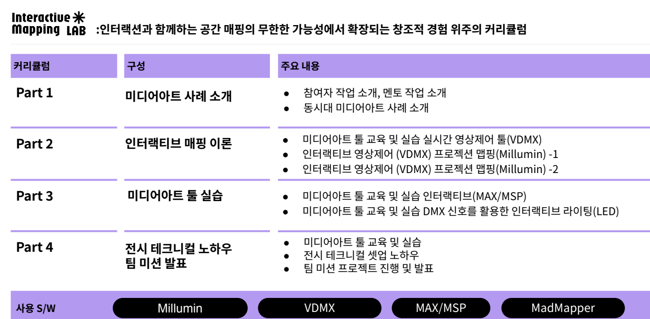 아래 표는 인터렉티브 매핑 랩의 커리큘럼 과정입니다. 이 과정을 거쳐 12월 초 <산책> 시연회가 열리게 됩니다.